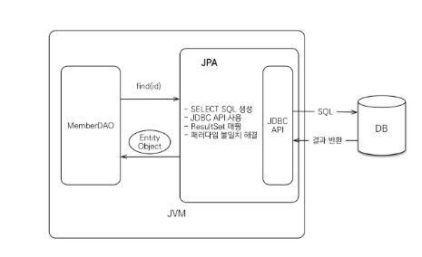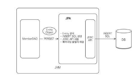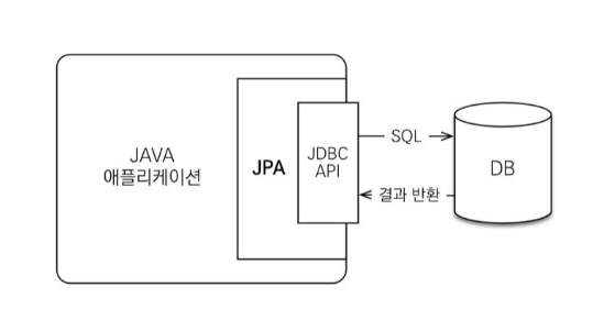 Java application과 JDBC 사이에서 동작하며 개발자가 JPA를 사용하면 JPA 내부에서 JDBC API를 사용해 SQL을 호출해 DB와 통신하게 된다. 개발자가 직접 JDBC API를 사용하는 것이 아니다. 예시를 살펴보자.