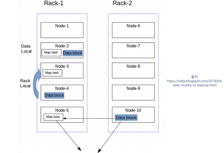 - Rack Local : best case 실패, 불가피하게 하나의 rack에서 다른 노드에 있는 것 copy