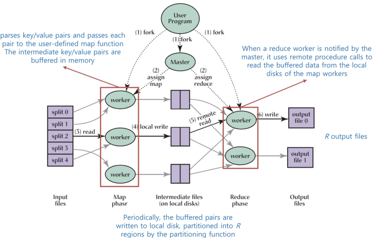 - 주기적으로 buffering된 pair들이 localdisk에 저장, R개의 region으로 parition되어 있음