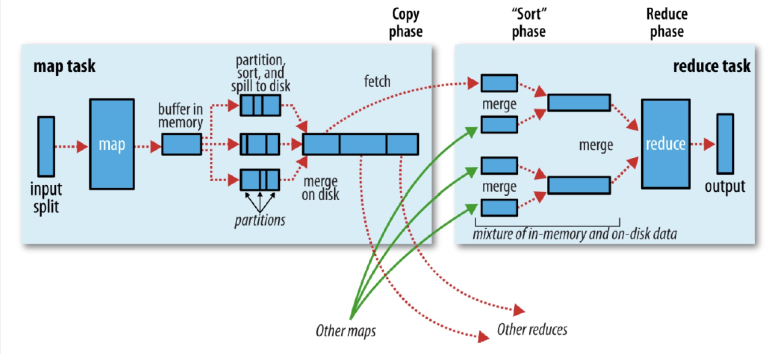 - shuffling 단계가 MapReduce에서 가장 복잡하고 가장 오버헤드가 큼(네트워크 통신이 많이 일어남)