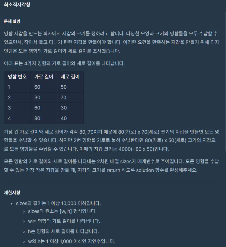 int h = Math.min(sizes[i][0], sizes[i][1]); //세로 길이 설정, 가로를 max로 잡았으므로 min은 자동으로 세로