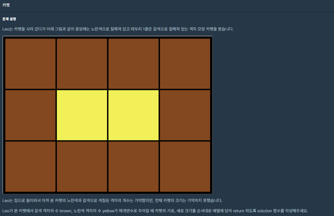 처음엔 갈색 블럭 - 4 (귀퉁이 제거) -> 앞에서 구한 값 /2 해서 가로+세로 타일 개수 구하기 -> yellow 타일 개수 가능한 N*M 조합을 찾는 방식으로 풀었는데 얘의 단점은 가로로 긴 경우에 구멍이 난다는 것...!