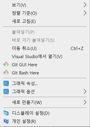 바탕화면에서 마우스 우클릭을 해주면 다음과 같은 창이 뜬다