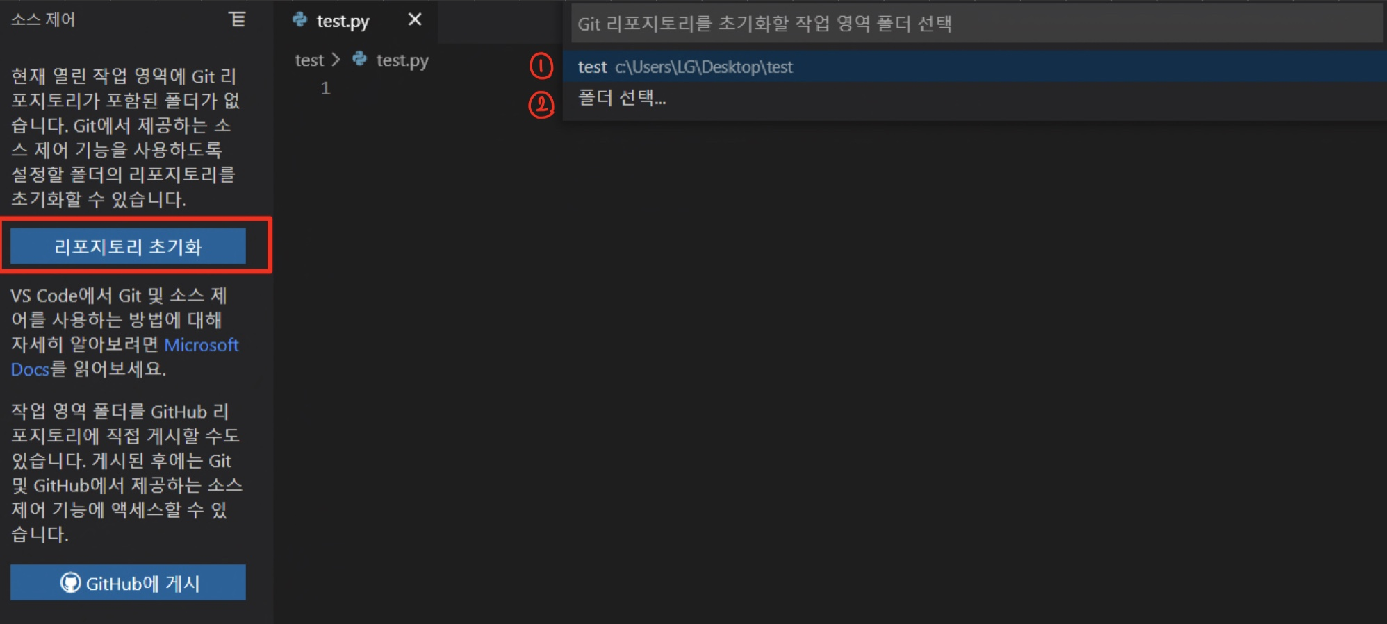 2. 폴더 선택 -> 원하는 폴더에 .git 폴더 생성
